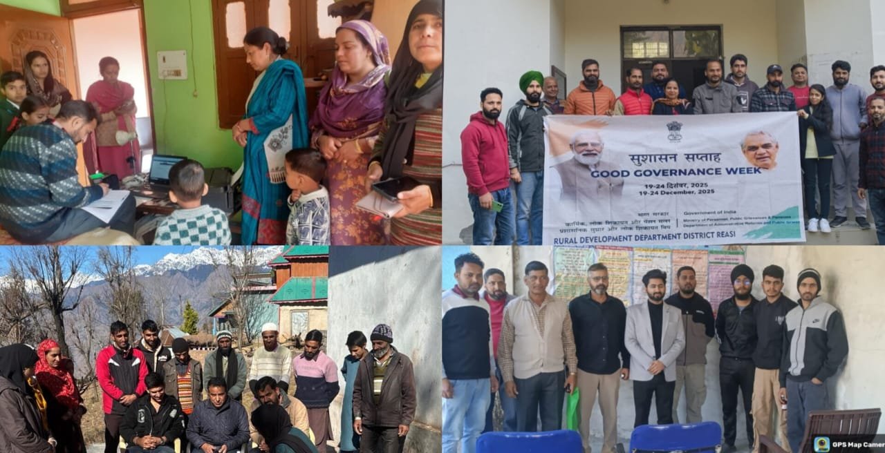 Reasi, December 24: On the sixth day of the week-long Good Governance Week campaign “Prashasan Gaon Ki Ore”, the District Administration Reasi, under the guidance of Deputy Commissioner Reasi, Nidhi Malik, continued its sustained grassroots outreach initiatives aimed at delivering government services at the doorsteps of citizens and promoting responsive, transparent and citizen-centric governance across the district.As part of the campaign, the Agriculture Department organized a Prashasan Gaon Ki Ore camp at Panchayat Bharkh, Zone Pouni, Sub-Division Reasi, which witnessed enthusiastic participation from a large number of farmers. During the camp, farmers were sensitized about various flagship schemes of the department, including the Kisan Credit Card (KCC), Pradhan Mantri Fasal Bima Yojana (PMFBY) and the Soil Health Card (SHC) scheme. Officials encouraged farmers to avail benefits under these schemes, and three KCC application forms were filled on the spot to facilitate immediate service delivery.The Jal Shakti Department (Public Health Engineering), Sub-Division Katra, initiated door-to-door visits to the households of beneficiaries for the collection of water revenue and to address issues related to non-regularised water connections. The field staff engaged directly with residents to ensure public-friendly revenue collection, hassle-free grievance redressal and enhanced accountability at the grassroots level.Additionally, Aadhaar – enrolment and updation- camps were organized at various panchayats under the Poshan Project Reasi as part of Sushasan Saptah. These camps aimed to facilitate Aadhaar services for beneficiaries across all age groups, thereby strengthening access to welfare schemes and ensuring inclusion of all eligible beneficiaries.Good Governance Week: District Administration Reasi Continues Grassroots Outreach on Day 6.Reasi, December 24: On the sixth day of the week-long Good Governance Week campaign “Prashasan Gaon Ki Ore”, the District Administration Reasi, under the guidance of Deputy Commissioner Reasi, Nidhi Malik, continued its sustained grassroots outreach initiatives aimed at delivering government services at the doorsteps of citizens and promoting responsive, transparent and citizen-centric governance across the district.As part of the campaign, the Agriculture Department organized a Prashasan Gaon Ki Ore camp at Panchayat Bharkh, Zone Pouni, Sub-Division Reasi, which witnessed enthusiastic participation from a large number of farmers. During the camp, farmers were sensitized about various flagship schemes of the department, including the Kisan Credit Card (KCC), Pradhan Mantri Fasal Bima Yojana (PMFBY) and the Soil Health Card (SHC) scheme. Officials encouraged farmers to avail benefits under these schemes, and three KCC application forms were filled on the spot to facilitate immediate service delivery.The Jal Shakti Department (Public Health Engineering), Sub-Division Katra, initiated door-to-door visits to the households of beneficiaries for the collection of water revenue and to address issues related to non-regularised water connections. The field staff engaged directly with residents to ensure public-friendly revenue collection, hassle-free grievance redressal and enhanced accountability at the grassroots level.Additionally, Aadhaar – enrolment and updation- camps were organized at various panchayats under the Poshan Project Reasi as part of Sushasan Saptah. These camps aimed to facilitate Aadhaar services for beneficiaries across all age groups, thereby strengthening access to welfare schemes and ensuring inclusion of all eligible beneficiaries.